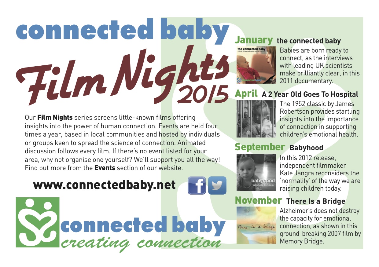 Dr. Suzanne Zeedyk, whom I interviewed in my film Babyhood, has set this up to bring groups together to watch films that “offer insights into the power of connection”, and then have a discussion around the subjects raised. Whenever I have shown my film, the discussions afterwards are the most interesting, and I am so pleased this will be happening in September throughout the UK!